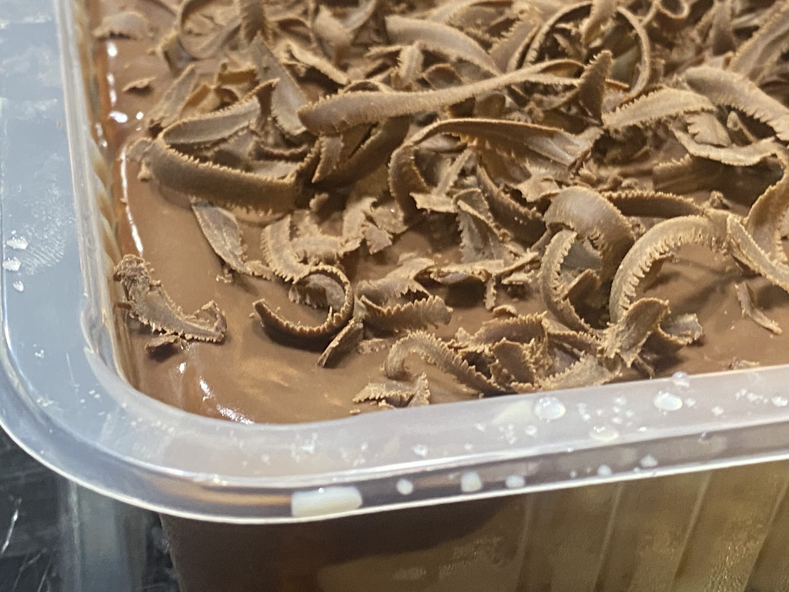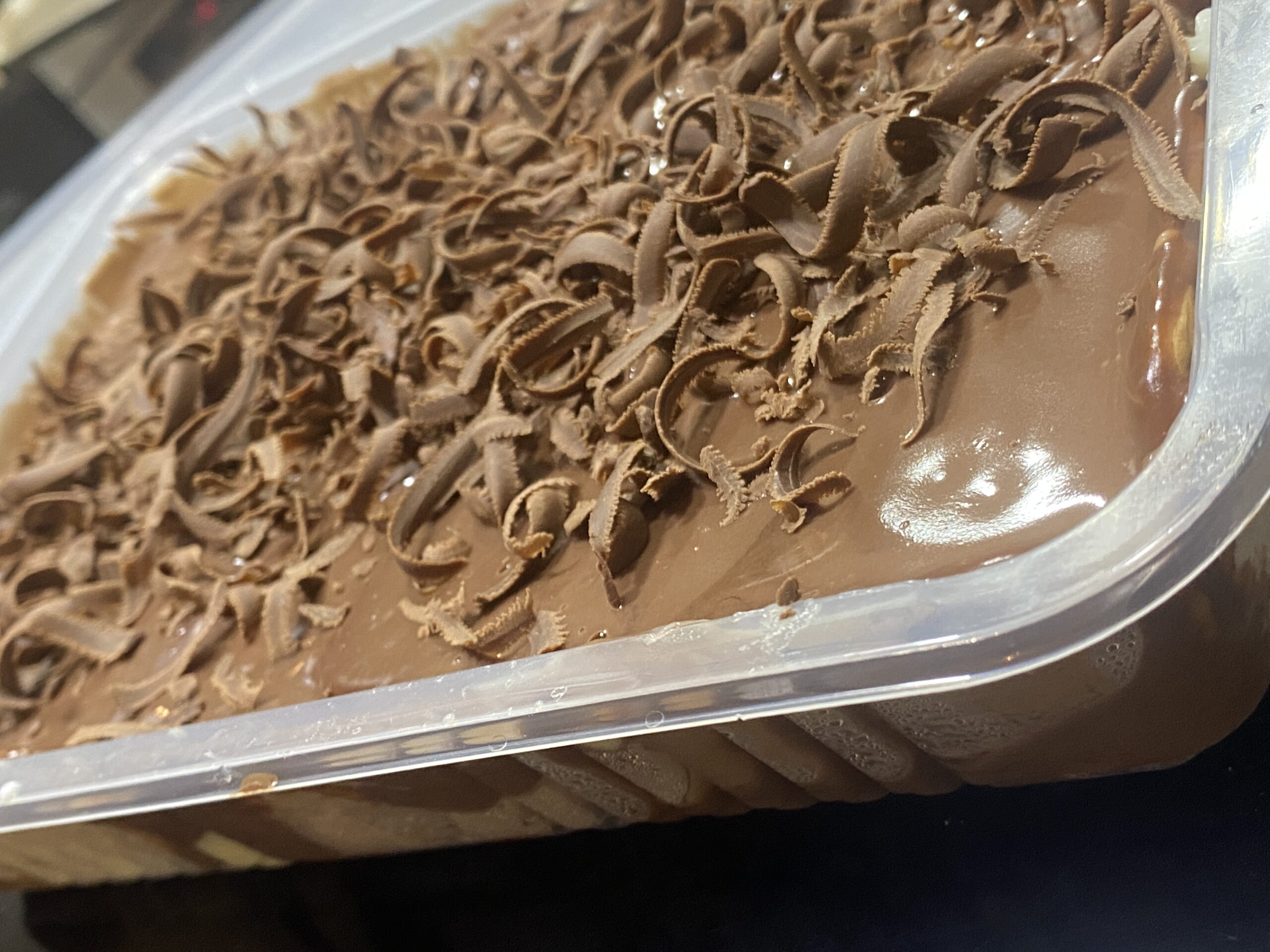 Panetone trufado com recheio cremoso e gotas de chocolate.